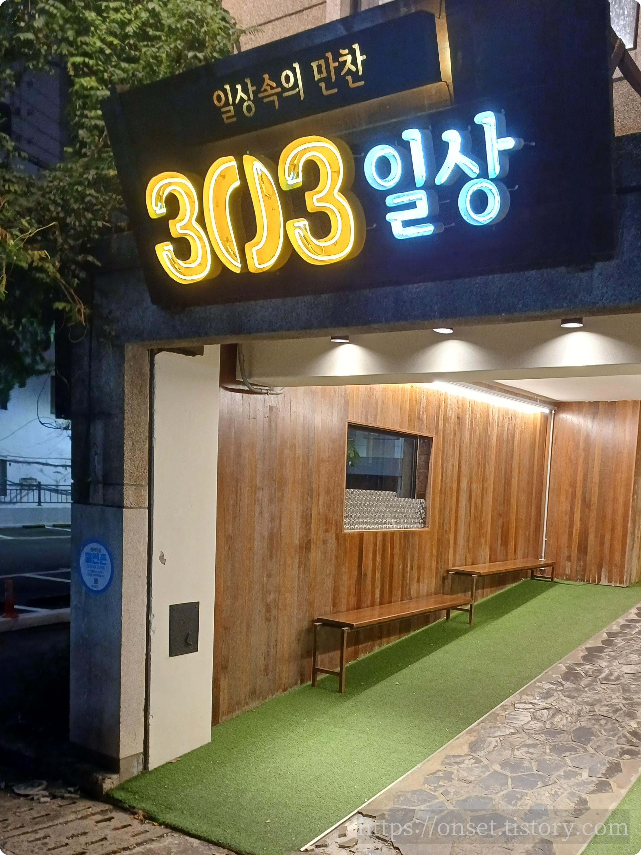 최근 아내의 생일날, 아내가 뭘 먹고 싶은지 물어보니, 여기 온천장의 303일상을 가고 싶다고 하더라고요. 그래서 개인적으로 여길 선호하지는 않지만, 아내가 생일날 먹고 싶다고 하니, 당연히 가보게 되었습니다. 저녁 7시반쯤 예약을 하고 가보게 되었는데... 역시 맛집이라서 그런지 주차장에 차가 많더라고요 2~3주차 자리 남았길래 다행히 주차를 했습니다. 일단 입구로 가보시면 아래와 같이 간판이 보입니다.